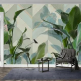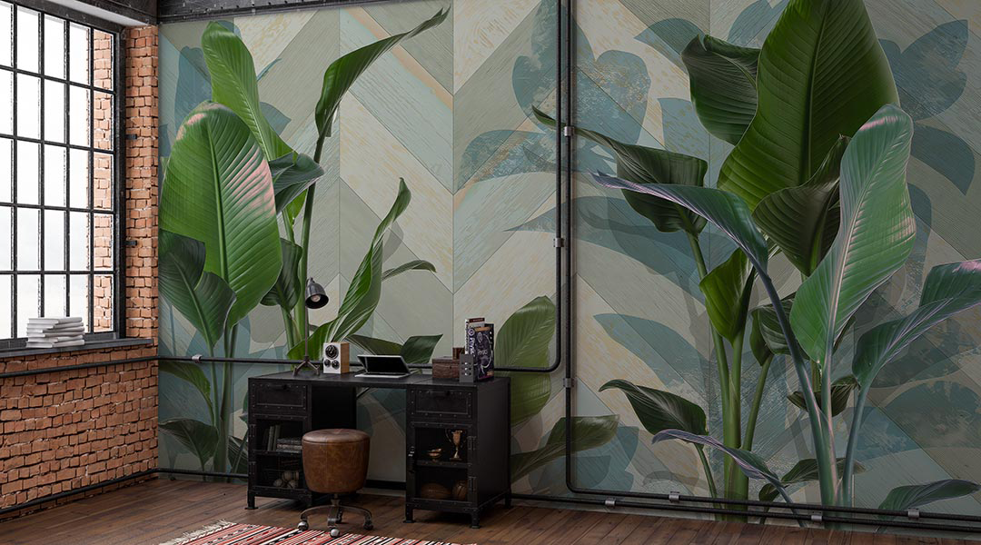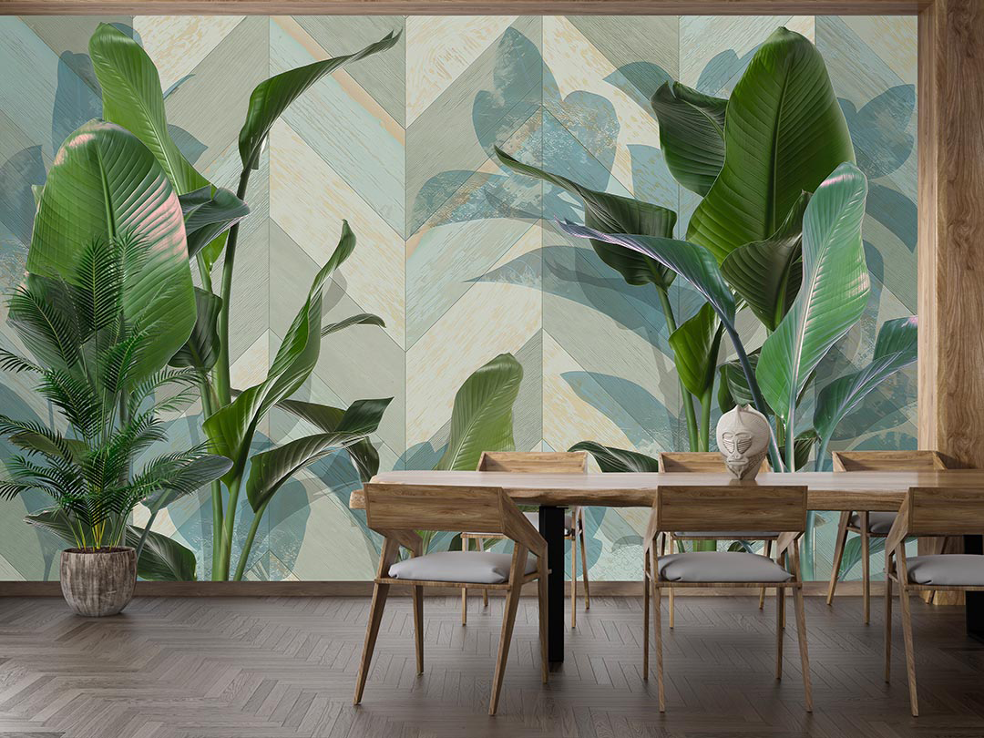 Bu tasarım, tropik yaprakların canlılığını ve enerjisini geometrik desenlerin modern çizgileriyle bir araya getirerek dinamik ve çağdaş bir atmosfer yaratıyor. Yaprakların keskin hatları ve canlı renkleri, geometrik desenlerin düzeniyle buluşarak hem doğanın gücünü hem de modern sanatın estetiğini yansıtıyor. Bu eser, mekanlara enerji, hareket ve sofistike bir hava katıyor.