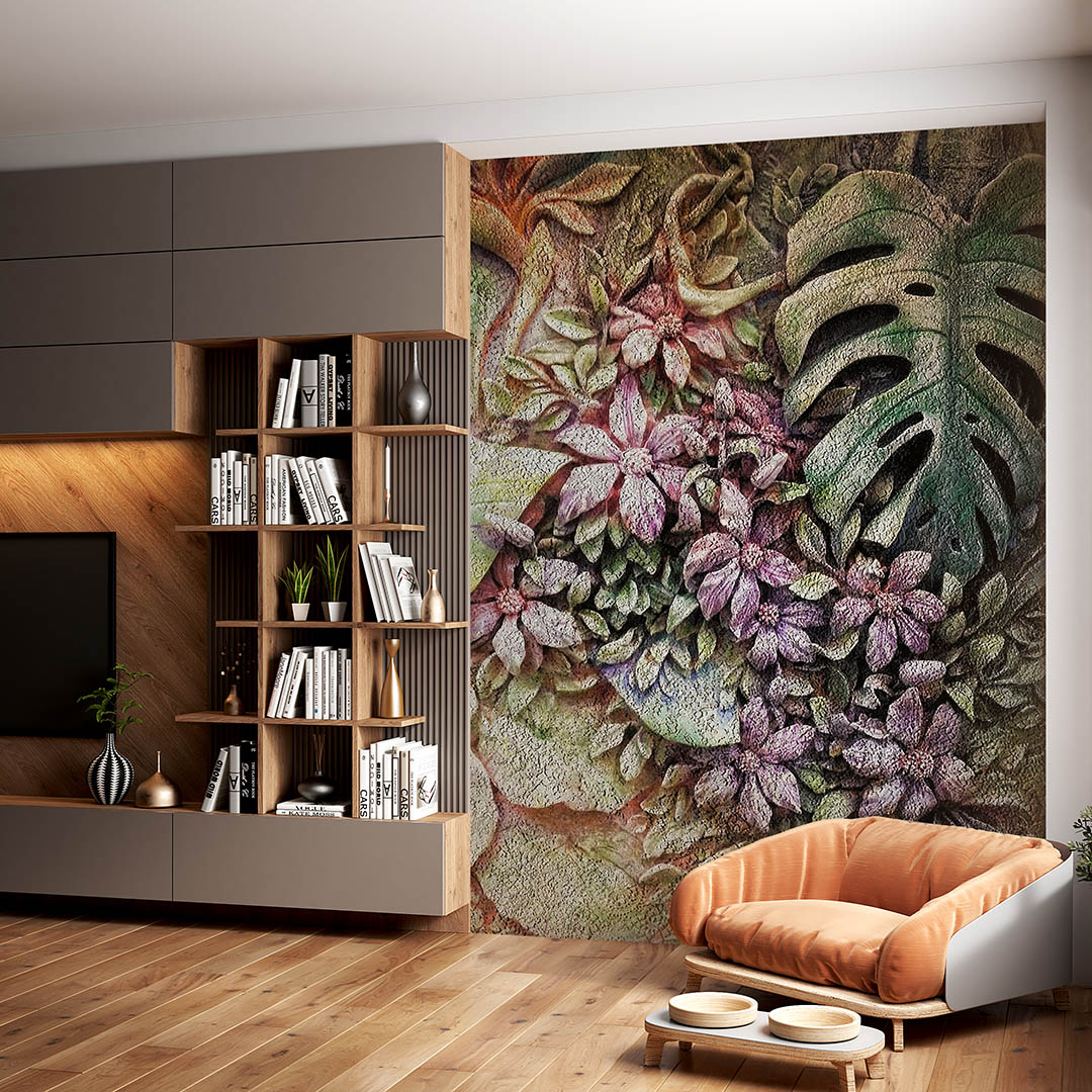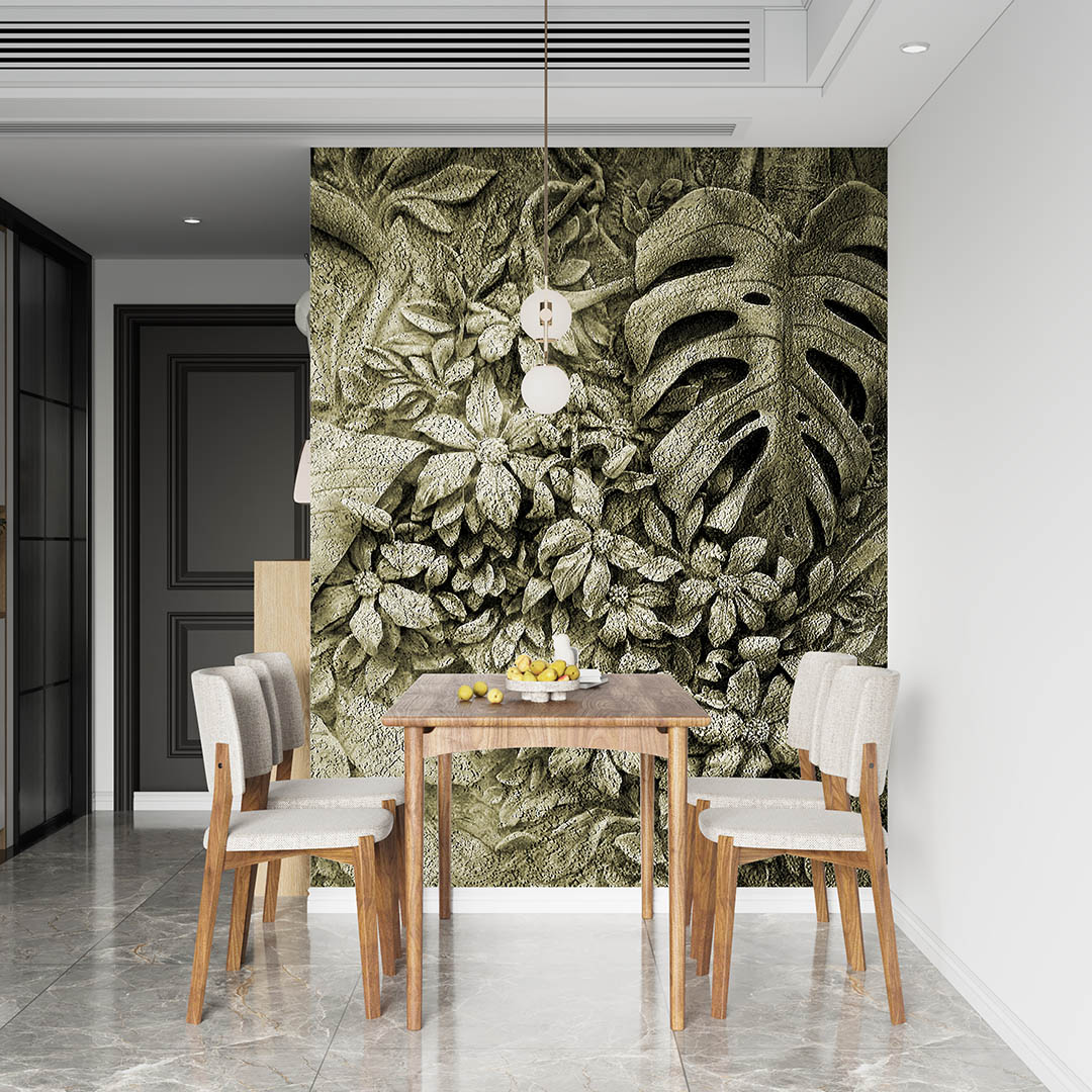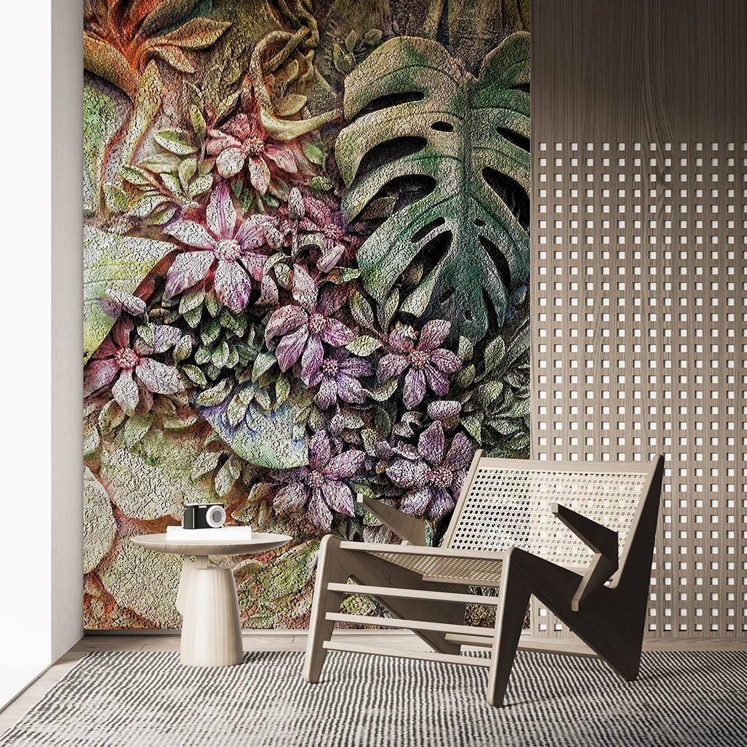 Bu tasarım, tropik yaprakların gizemli ve büyüleyici dokusunu yansıtıyor. Taş kabartma sanatının derinliği ile yeşil ve morun mistik uyumu, mekana benzersiz bir hava katıyor. Bu eser, yaşam alanlarınıza hem sanatsal bir dokunuş hem de mistik bir atmosfer taşıyarak, ortama derinlik ve karakter kazandırıyor.