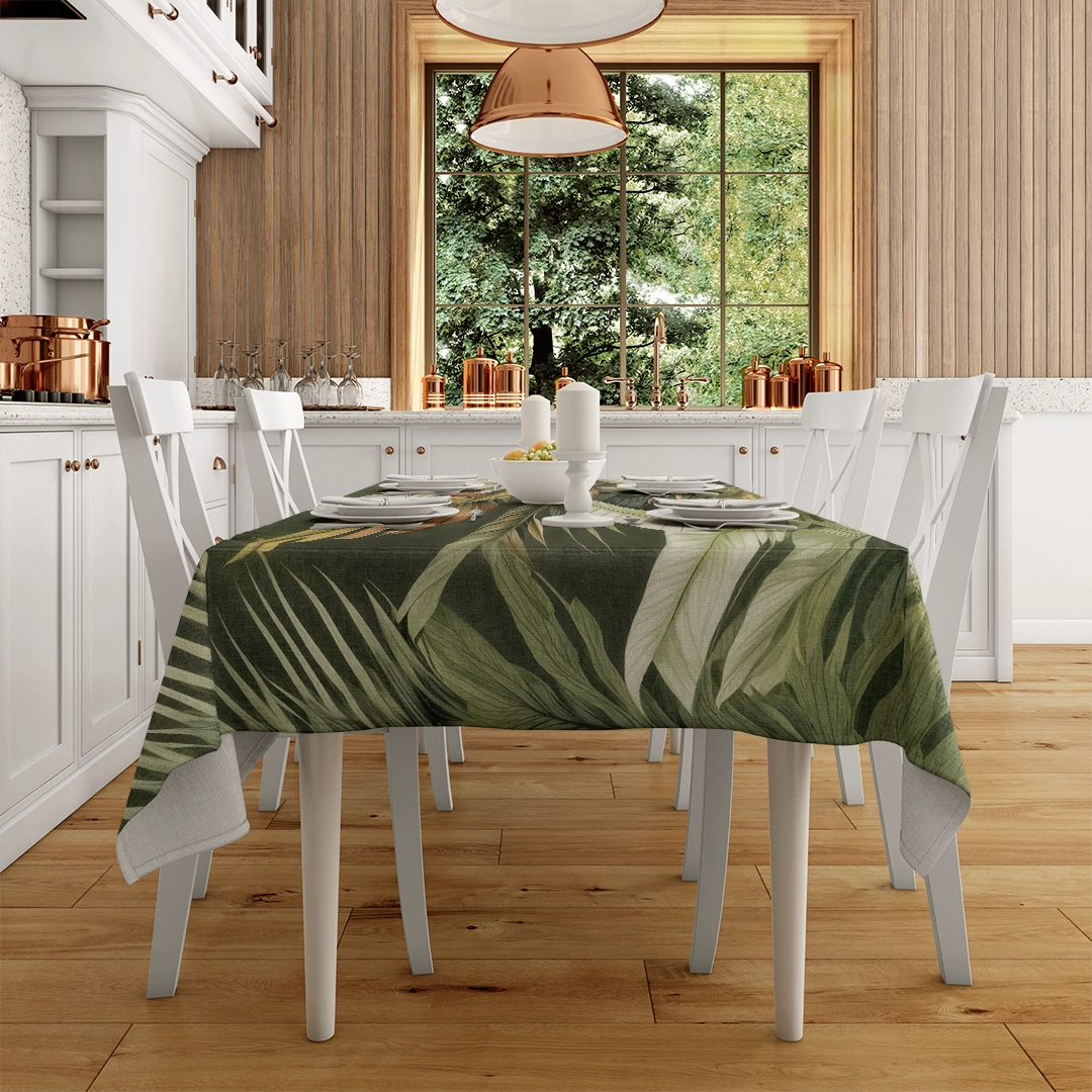 - Runner: Uzun bir masanın ortasına yerleştirildiğinde, yeşil yaprakların desenlerini sergiler. Yemeklerinize hem görsel bir şölen hem de tropikal bir zarafet katar.