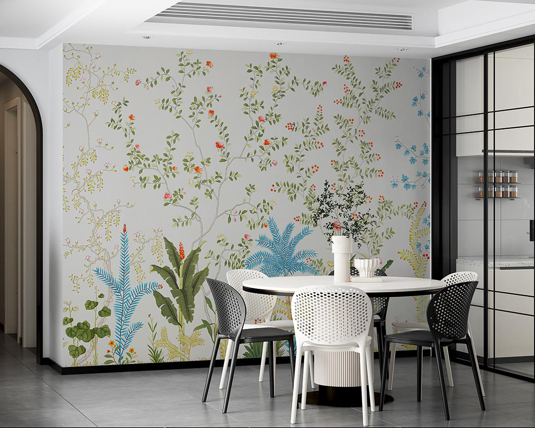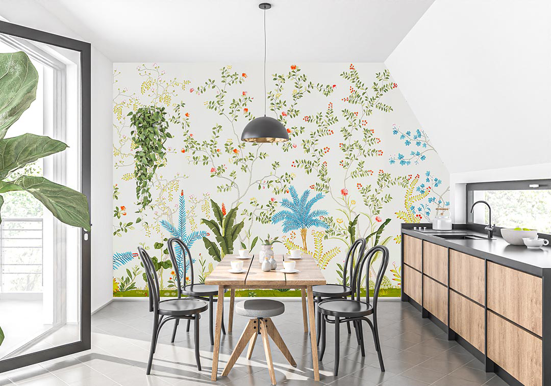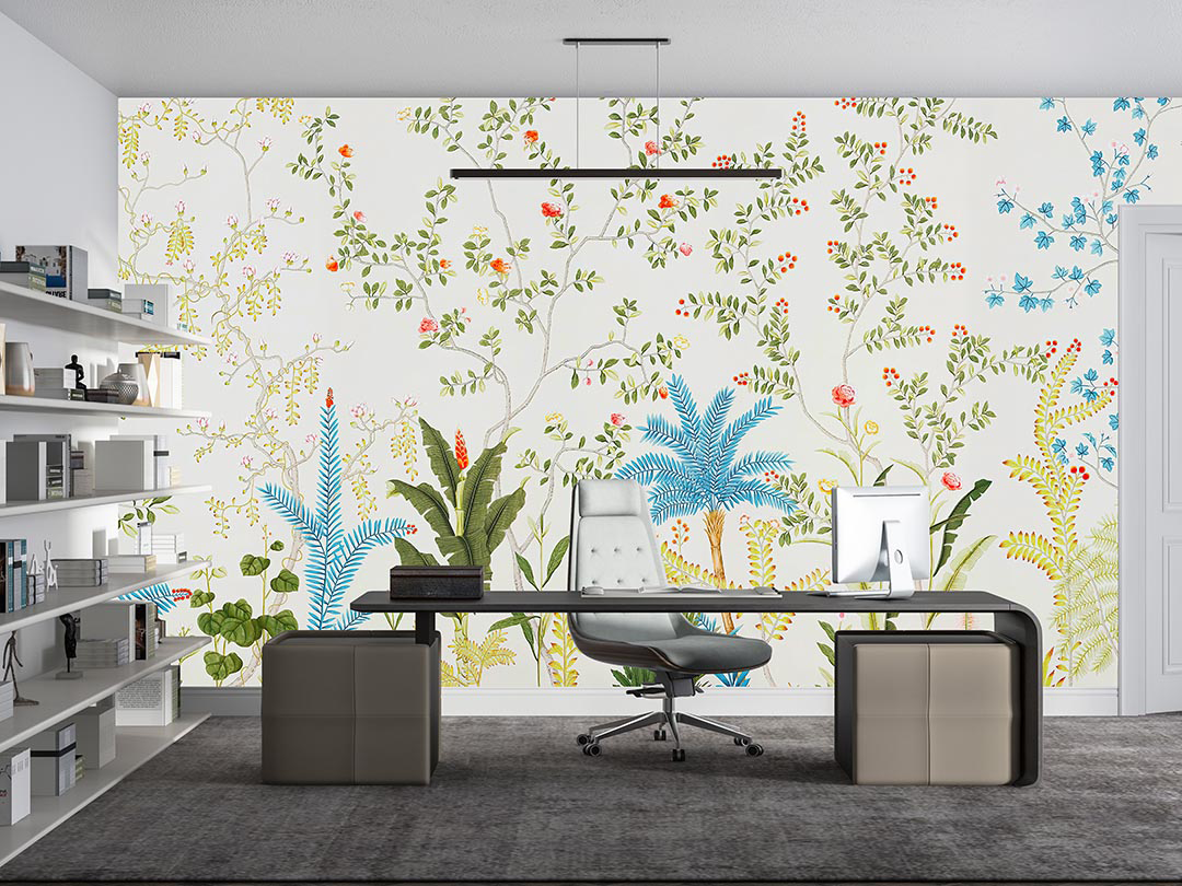 Bu tasarım, tropikal bir bahçenin canlı ve renkli senfonisini yansıtıyor. Çeşitli çiçekler, yemyeşil yapraklar ve enerjik desenler, izleyiciye neşe ve canlılık dolu bir atmosfer sunuyor. Bu eser, tropikal bahçenin zenginliğini ve enerjisini mekanlara taşıyarak, pozitif ve ilham verici bir etki yaratıyor.