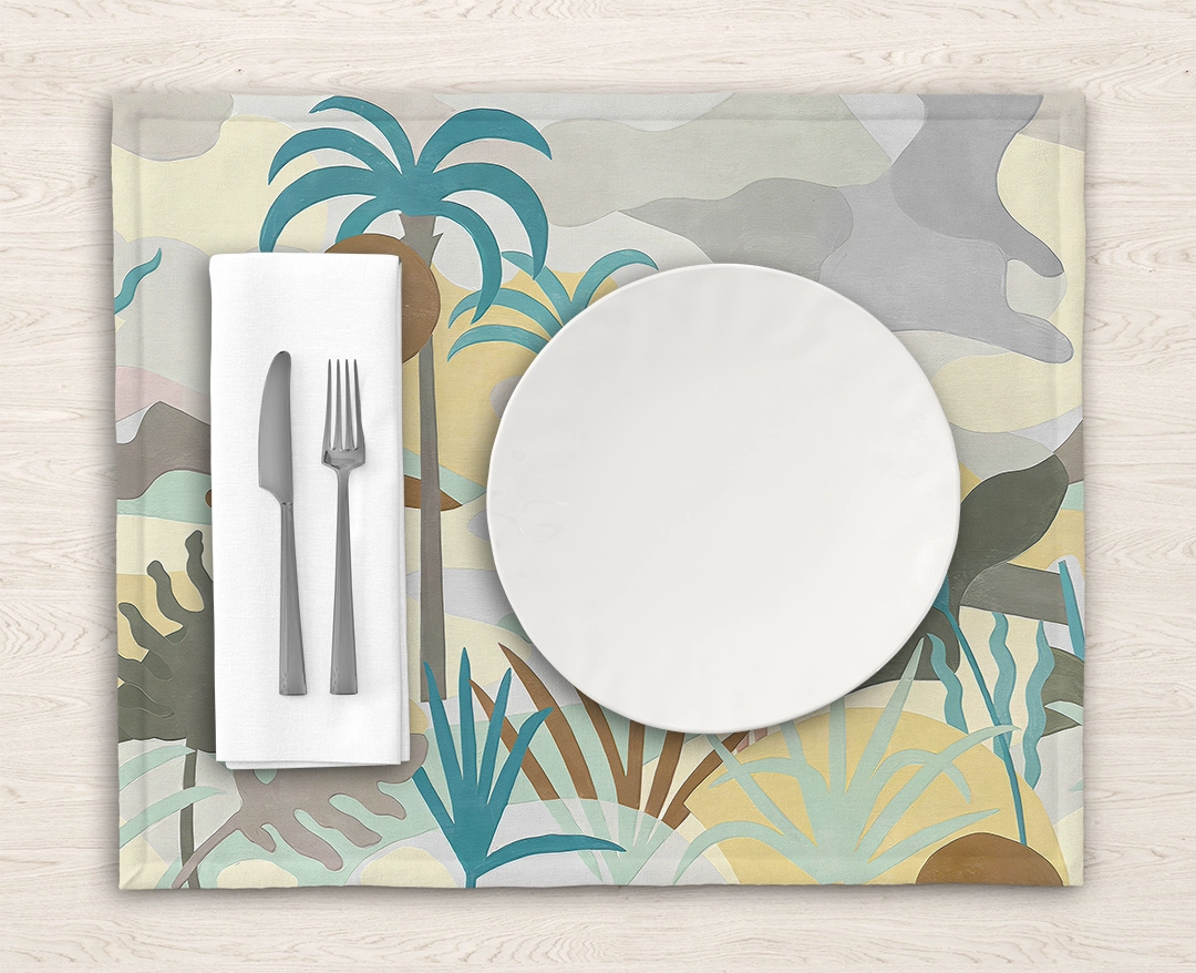 Bu tasarım, tropikal bir düşü andıran pastel renkler ve egzotik bitkilerle dolu bir sahne sunuyor. Palmiye ağaçları, yumuşak renk tonları ve zarif detaylar, izleyiciye huzurlu ve rahatlatıcı bir atmosfer sunuyor. Bu eser, tropikal bir düşün dinginliğini ve güzelliğini mekanlara taşıyarak, huzurlu ve ilham verici bir etki yaratıyor.