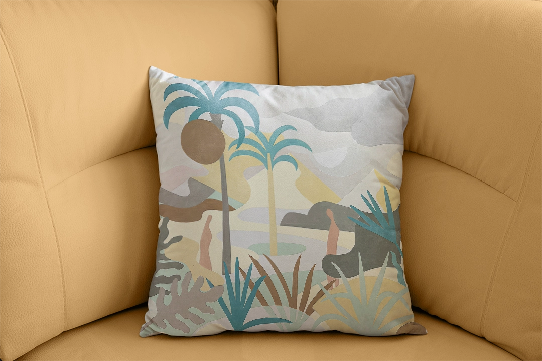 Bu tasarım, tropikal bir düşü andıran pastel renkler ve egzotik bitkilerle dolu bir sahne sunuyor. Palmiye ağaçları, yumuşak renk tonları ve zarif detaylar, izleyiciye huzurlu ve rahatlatıcı bir atmosfer sunuyor. Bu eser, tropikal bir düşün dinginliğini ve güzelliğini mekanlara taşıyarak, huzurlu ve ilham verici bir etki yaratıyor.