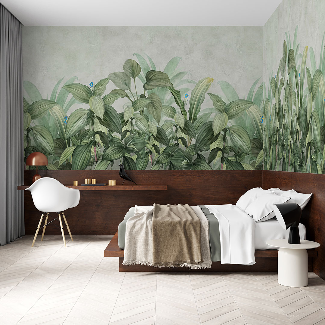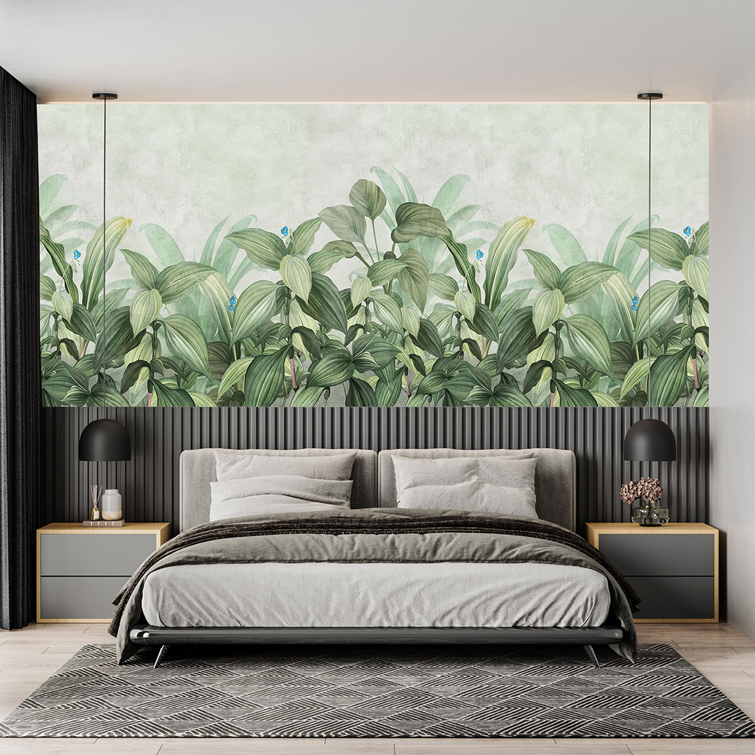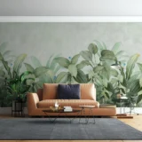 Bu tasarım, yeşilin farklı tonlarındaki yaprakların canlılığını ve ferahlığını yansıtıyor. Yaprakların doğal dokusu ve desenleri, mekana tropikal bir ormanın huzurunu ve canlılığını taşıyor. Bu tasarım, izleyicisine doğanın tazeliğini ve dinginliğini sunarak ferahlatıcı ve davetkar bir atmosfer yaratıyor.
