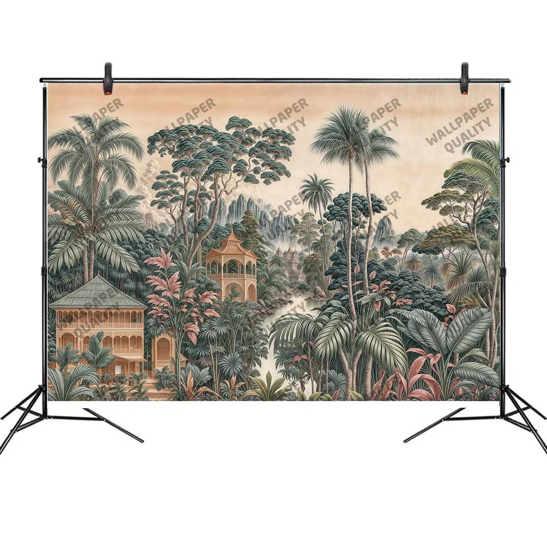 Bu tasarım, egzotik bir tropik cennetin derinliklerinde gizlenmiş, mistik tapınakların ve yemyeşil bitki örtüsünün büyüleyici atmosferini fırça darbeleriyle gözler önüne seriyor. Uzun palmiye ağaçları ve yoğun bitki örtüsü, manzaraya derinlik ve doğal bir ihtişam katarken, aralarından görünen antik yapılar, uzak diyarların kadim sırlarını fısıldıyor. Her fırça darbesi, bitkilerin detaylarını, ışığın ve gölgenin oyununu ve uzaklardaki dağların silüetini vurgularken, yeşilin, kahverenginin ve soluk bejin zengin tonları, bu sahnenin huzurunu ve gizemini hissettiriyor. İzleyicide bir hayranlık, sakinlik ve keşfetme arzusu uyandırırken, aynı zamanda kaybolmuş bir cennetin veya rüyanın parçası olma hissini veriyor. Bu görsel, ruhu dinlendiren, hayal gücünü harekete geçiren ve sizi egzotik bir yolculuğa davet eden bir kapı aralıyor.