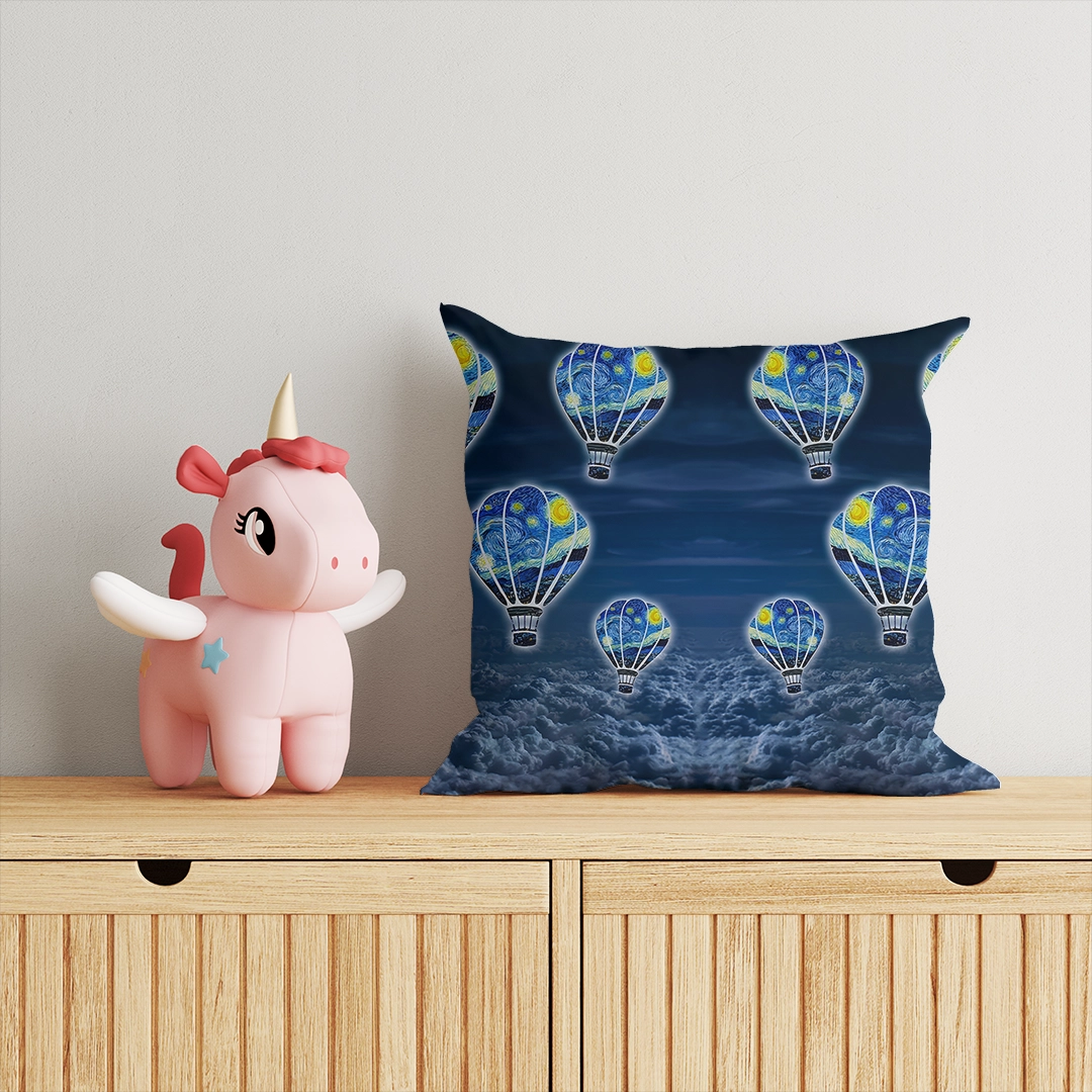 Bu büyüleyici tasarım, Van Gogh’un ünlü “Yıldızlı Gece” tablosundan ilham alıyor. Derin mavi tonları ve hareketli fırça darbeleri, gece gökyüzünün mistik ve rüya gibi atmosferini yansıtıyor. Balonların eklenmesiyle tasarıma fantastik bir hava katılıyor. Bu görsel, izleyiciyi hayal gücünün sınırlarında bir yolculuğa çıkarıyor.