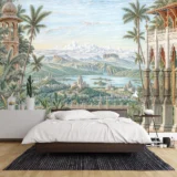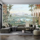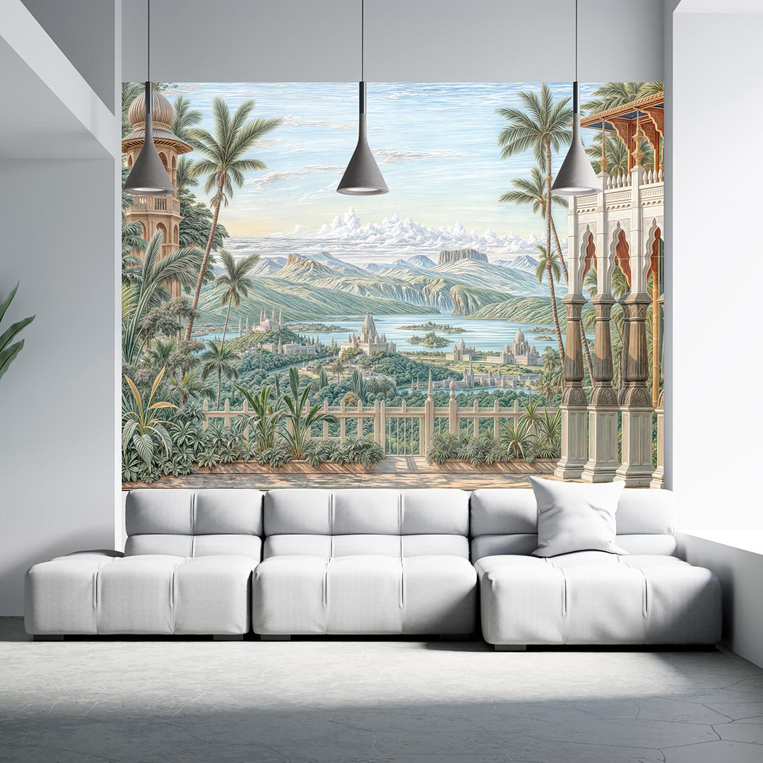 Bu tasarım, egzotik bir doğu masalının derinliklerinde gizlenmiş, antik şehirlerin ve dingin bir gölün büyüleyici atmosferini fırça darbeleriyle gözler önüne seriyor. Yüksek palmiye ağaçları ve yemyeşil bitki örtüsü, manzaraya derinlik ve doğal bir ihtişam katarken, uzakta görünen kadim şehirler ve gölün sakin suları, geçmişin sırlarını fısıldıyor. Her fırça darbesi, bitkilerin detaylarını, binaların zarif mimarisini ve suyun dinginliğini vurgularken, yeşilin, bejin ve mavinin zengin tonları, bu sahnenin huzurunu ve büyüsünü hissettiriyor. İzleyicide bir hayranlık, sakinlik ve keşfetme arzusu uyandırırken, aynı zamanda kaybolmuş bir cennetin veya rüyanın parçası olma hissini veriyor. Bu görsel, ruhu dinlendiren, hayal gücünü harekete geçiren ve sizi egzotik bir yolculuğa davet eden bir kapı aralıyor.