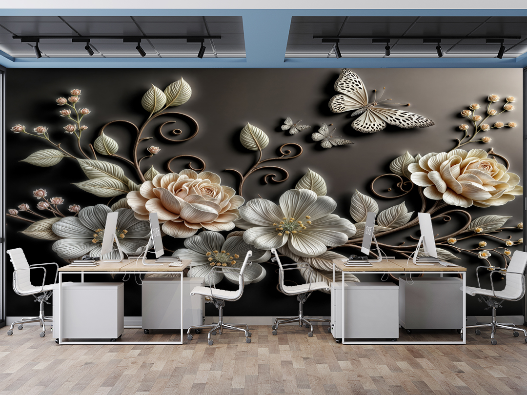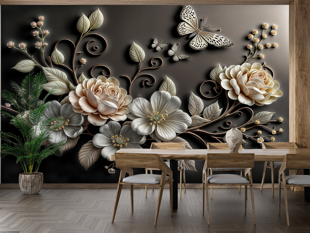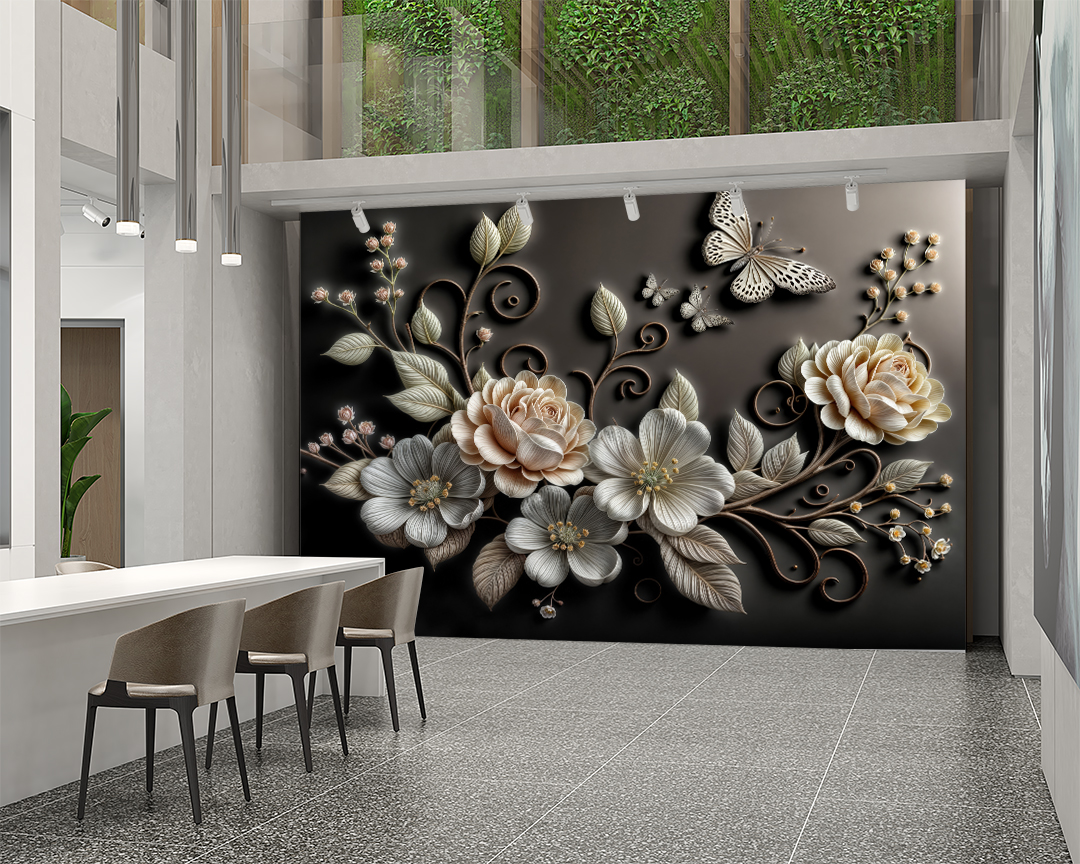 Bu büyüleyici sanat eseri, zarif çiçeklerin ve uçuşan kelebeklerin ahenkli dansını gözler önüne seriyor. Mistik desenlerle zenginleştirilmiş kompozisyon, izleyicisini hayal dünyasına davet ediyor. Kelebeklerin özgürlüğü ve çiçeklerin zarafeti, bu tasarımda bir araya gelerek mekanlara huzur ve ilham verici bir atmosfer katıyor.