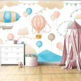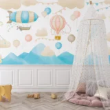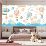 Bu tasarım, gökyüzünde süzülen zeplinler ve rengarenk balonlarla dolu eğlenceli bir çocuk dünyasını yansıtıyor. Pastel tonlardaki bulutlar ve sevimli desenler, neşeli ve huzurlu bir atmosfer yaratıyor. Zeplinlerin ve balonların hareketi, çocukların hayal gücünü harekete geçirirken, gökyüzündeki bu renkli yolculuk onlara özgürlük ve macera duygusu aşılıyor. Bu görsel, çocukların düşlerindeki dünyayı yansıtarak onlara keyifli bir deneyim sunuyor.