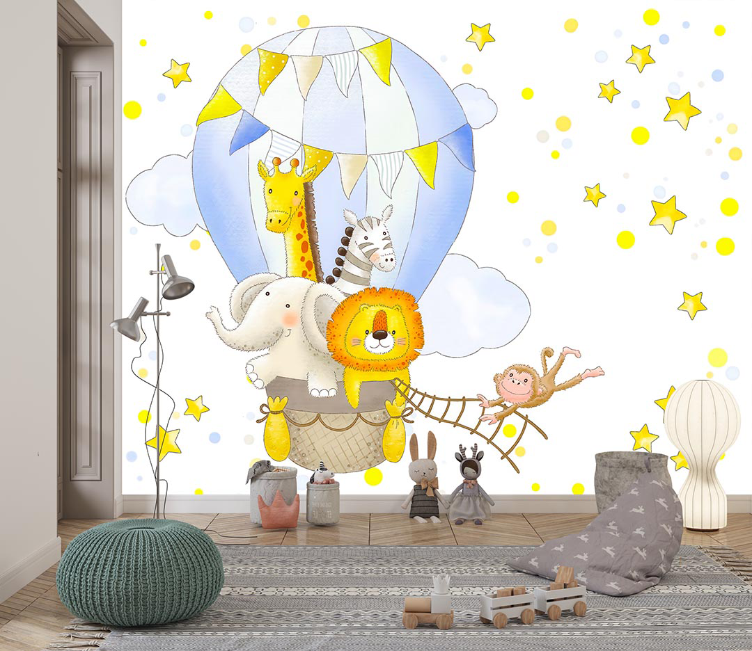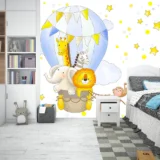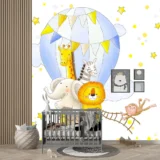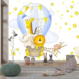 Bu sevimli görselde, bir balon sepetinde yolculuk yapan zürafa, aslan, fil, zebra ve maymun resmediliyor. Parlak ve neşeli renkler, çocuksu bir merak ve macera duygusu uyandırıyor. Yıldızlarla dolu gökyüzü ve bulutlar, hayal gücünün sınırlarını zorlayan bir atmosfer yaratıyor. Bu eser, dostluk, keşif ve eğlence temalarını bir araya getirerek izleyicilere keyifli bir hikaye sunuyor.